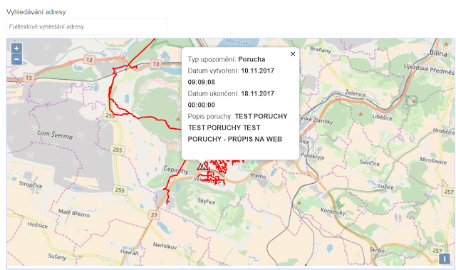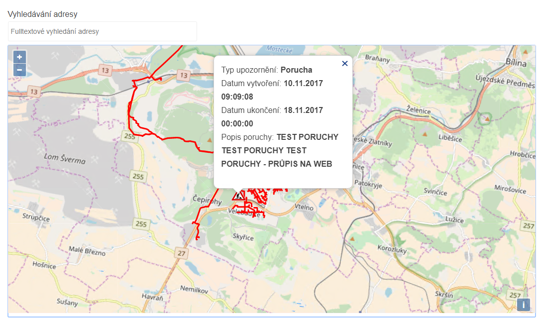 Při výběru události v mapě se uživateli zobrazí detailní informace (předpokládané datum ukončení, krátký popis události) o poruše či plánované odstávce. Mimo tyto informace je součástí mapového okna grafické zobrazení průběhu provozovaných sítí společností Severočeská teplárenská. Uživatel má také k dispozici fulltextové vyhledání adresy pro rychlou lokalizaci svého odběrného místa.