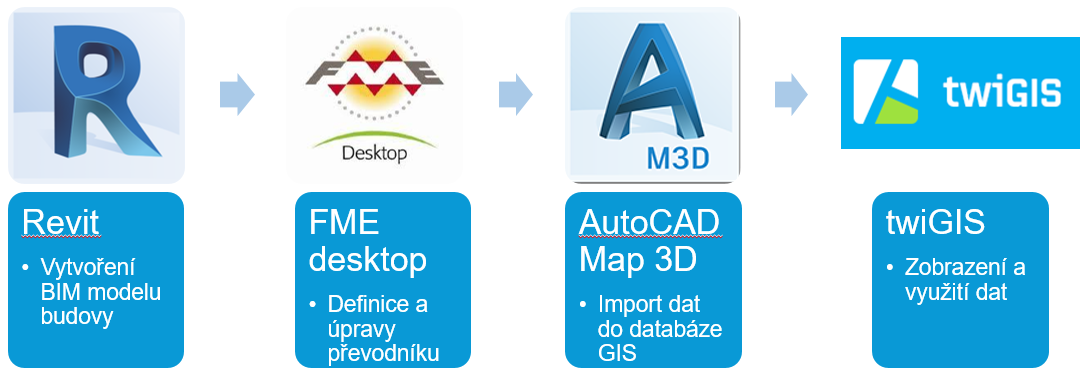 Pro konverzi a transformaci dat z BIM modelu, jsme využili software FME Desktop. Ten dokáže třídit vstupy z BIM modelu podle potřeby uživatele (hierarchie, geometrie, atributy,...) a následně je vyexportovat do databáze. V tomto případě se jednalo o SQLite. Revit a další BIM nástroje prozatím nepracují v souřadnicovém systému, proto bylo nutné migrovaná data umístit do souřadnic. Za tímto účelem jsme využili software AutoCAD Map 3D. Mimo usazení do souřadného systému jsme Map 3D využili také pro import vytěžených dat (SQLite) do oborového modelu/databázového schématu GIS.